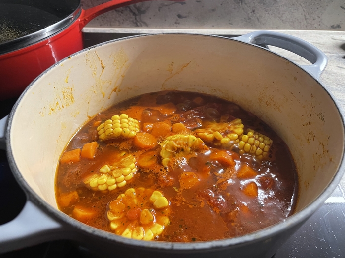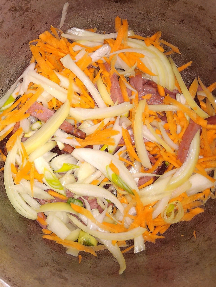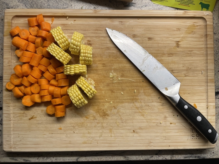 Нарезать морковь и кукурузу. Просто удобными кусками. И кукурузу потом есть не обязательно, если что😉