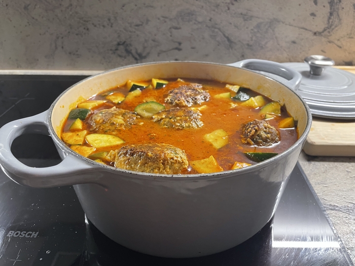 Если нужно ещё жидкости, то используем воду или, в идеальном случае, бульон. К меня как назло весь закончился😂и в конце топим в этом супе тефтели