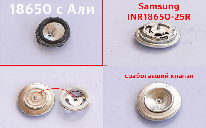 На минусовом контакте большинства (но не всех) моделей аккумуляторов 21700 Samsung присутствует маркировка, выполненная лазером. Символ "А" и номер. Но это встречается не на всех моделях. На аккумуляторах формата 18650 такой маркировки нет.