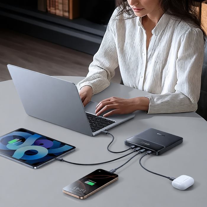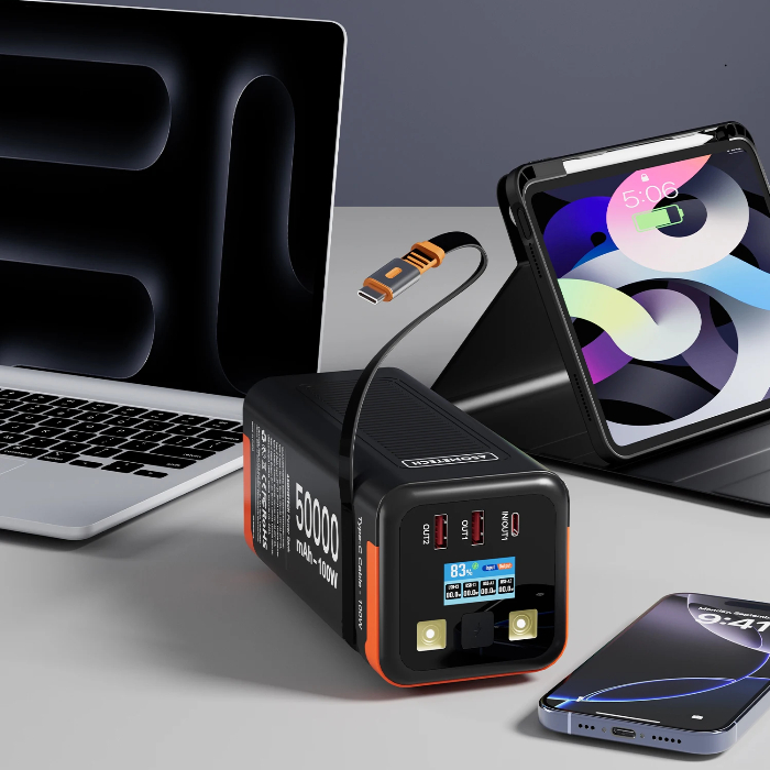 Повербанк ASOMETECH ёмкостью 50 000 мА·ч — это мощная портативная электростанция для самых требовательных пользователей. На его корпусе расположено сразу четыре порта для зарядки, включая удобный встроенный кабель Type-C. Поддержка технологии Power Delivery мощностью 100 Вт позволяет быстро заряжать даже игровые ноутбуки и профессиональную технику.