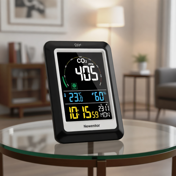 Измеритель качества воздуха Newentor поможет создать здоровый микроклимат в вашем доме или офисе. Он непрерывно отслеживает ключевые параметры: концентрацию CO2, мелкодисперсной пыли PM2.5 и PM10, температуру и влажность. Данные с высокоточных датчиков обновляются в режиме реального времени и выводятся на цветной дисплей.