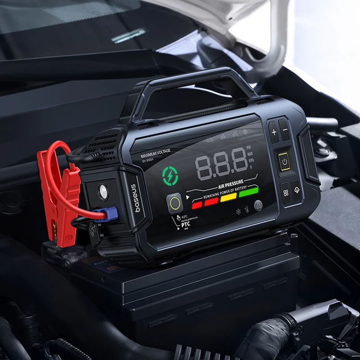 Пусковое устройство Baseus совмещает в себе четыре важнейших функции для автомобилиста в одном корпусе. Его пиковая пусковая сила тока в 3000 ампер уверенно заведёт двигатель с полностью севшим аккумулятором. Встроенный компрессор с манометром позволит быстро и точно накачать шины автомобиля, велосипеда или мяча.