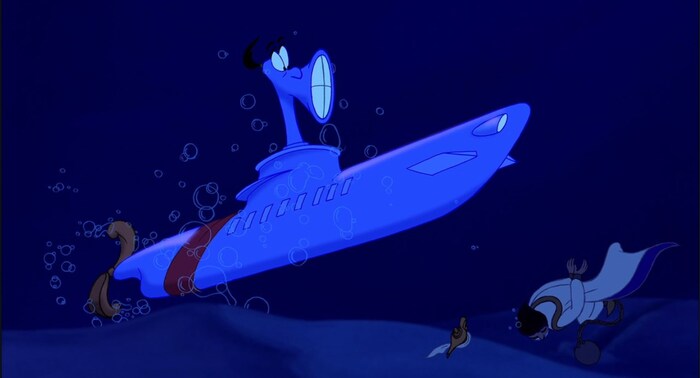 • Аладдин с Джинном увлечённо играют в приставку, пока Жасмин занимается уборкой;