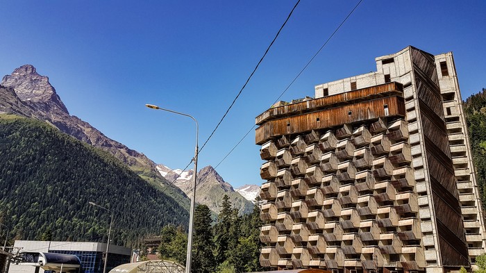 Домбай. Гостиница… Не помню. И Гугл помогать не хочет. Скажу точно — она там первая была построена. Ещё в совке. Индивидуальный проект и всё такое. Сейчас почему-то объявлена нерентабельной и не используется.