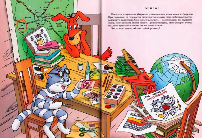 У появившейся таким образом на карте независимой страны Простоквашино есть свой герб (двуглавый кот Матроскин), свой флаг (с полосками Матроскина), свои деньги (с портретами Матроскина) и все другие признаки авторитарного котоцентризма. Судя по всему, Эдуард Успенский смотрел на своих героев без розовых очков, допуская, что если кто-то вроде них в действительности дорвется до власти, то о прежних временах народу предстоит повздыхать не раз и не два.