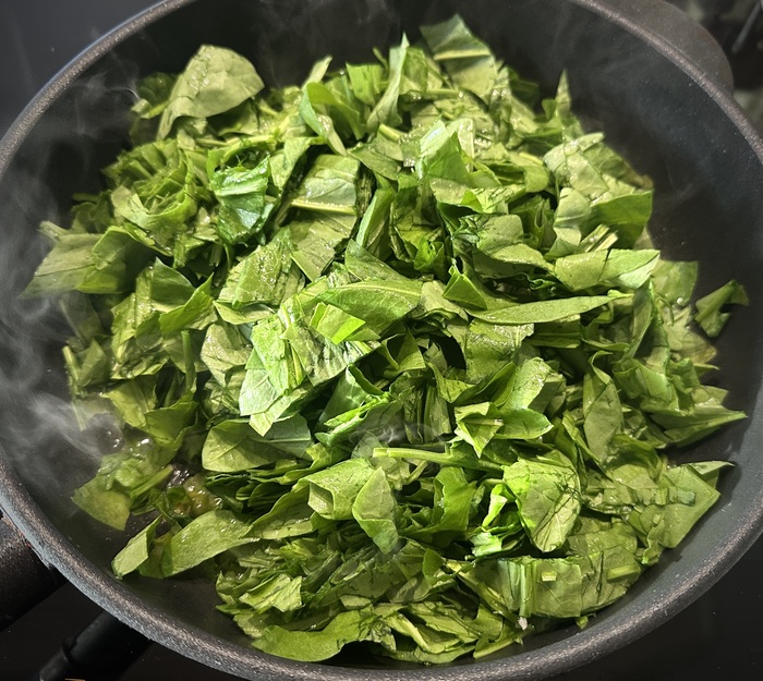 В большой чугунной сковороде растопил масла коровьего, топлёного опять же и выложил туда крупно нарезанный щавель.