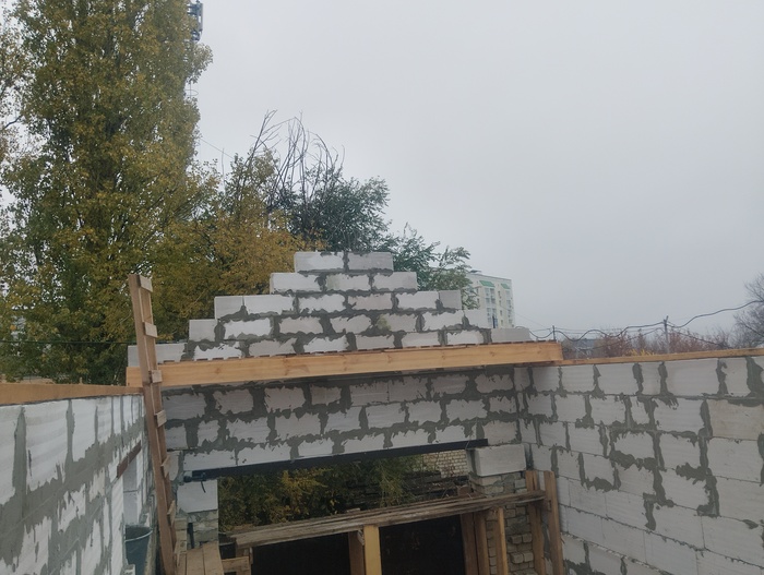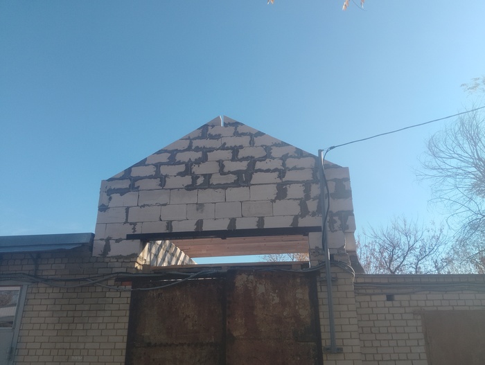 Давно не писал, то работа, то погода! Выложил фронтон, прианкерил мауэрлаты(вроде так называются)