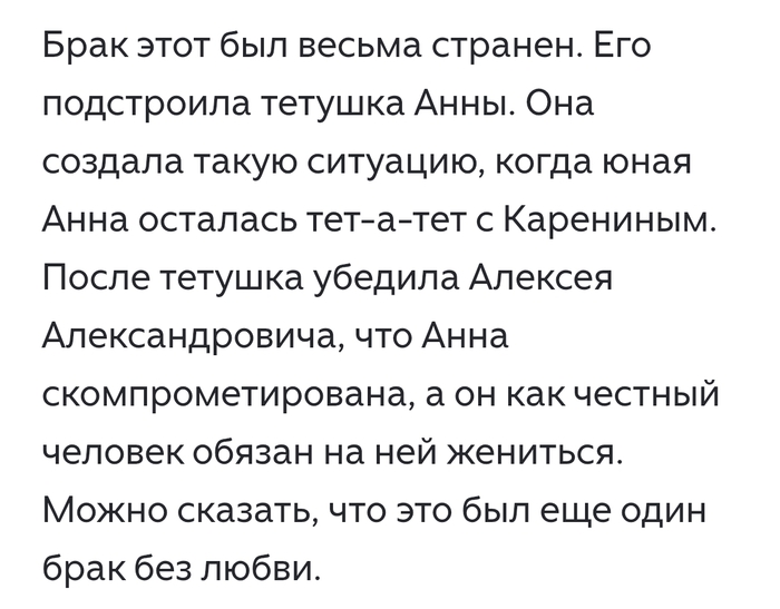 Соответственно мне хотелось уйти от темы обсуждения Анны и Каренина как личностей и их поступков, хотелось осветить одну из проблем, упомянутых выше.Однако, исходя из большинства комментариев, это все не важно, главный вопрос блядь каренина или нет, мне это обсуждать не интересно) Всем бобра и давайте больше читать.