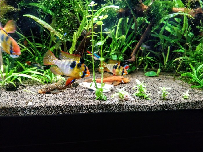 Я не профи, но азы оформления секретом не являются, делаем по правилам, где дисплей аквариума не должен показывать подложку. Питательный грунт выложил слоем около 1,5см., кварц сверху где-то 2-3см, мало, позже засыплю ещё. Дальше в ход пошли коряги, составил композицию, понравилось, на том и остановился. Спреем обильно смочил грунт и коряги, далее можно заливать воду и постепенно переводить рыб. Воду я использовал из старого аквариума, не сливать же такое добро, верно? Рыбам так лучше.