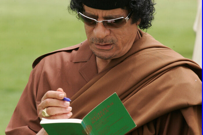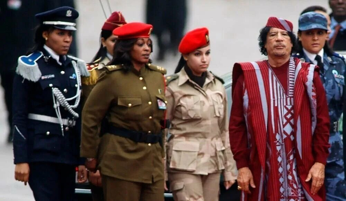 Эксцентричность: Женская охрана в шпильках и с автоматами, ночёвки в бедуинском шатре во время визитов в ЕС, 400-страничный трактат «Зелёная книга» с лозунгами вроде «Дом принадлежит тому, кто в нём живёт!».