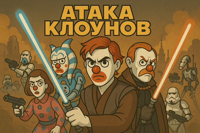 Сын в его 8 лет стал фанатом Звёздных Войн. 11 раз посмотрел третий эпизод. Досматривает сериалы. Я попросила Chat Gpt сгенерировать картинку - "Война Клоунов" в стиле Star Wars. По-моему вышло не плохо.