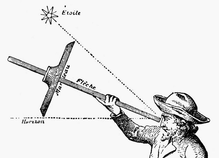 Необходимо подвесить астролябию за кольцо, так чтобы она ни за что не цеплялась. Теперь обращаем внимание на оборотную сторону астролябии и вращаем алидаду так, чтобы искомый объект был виден в щель между визирами.