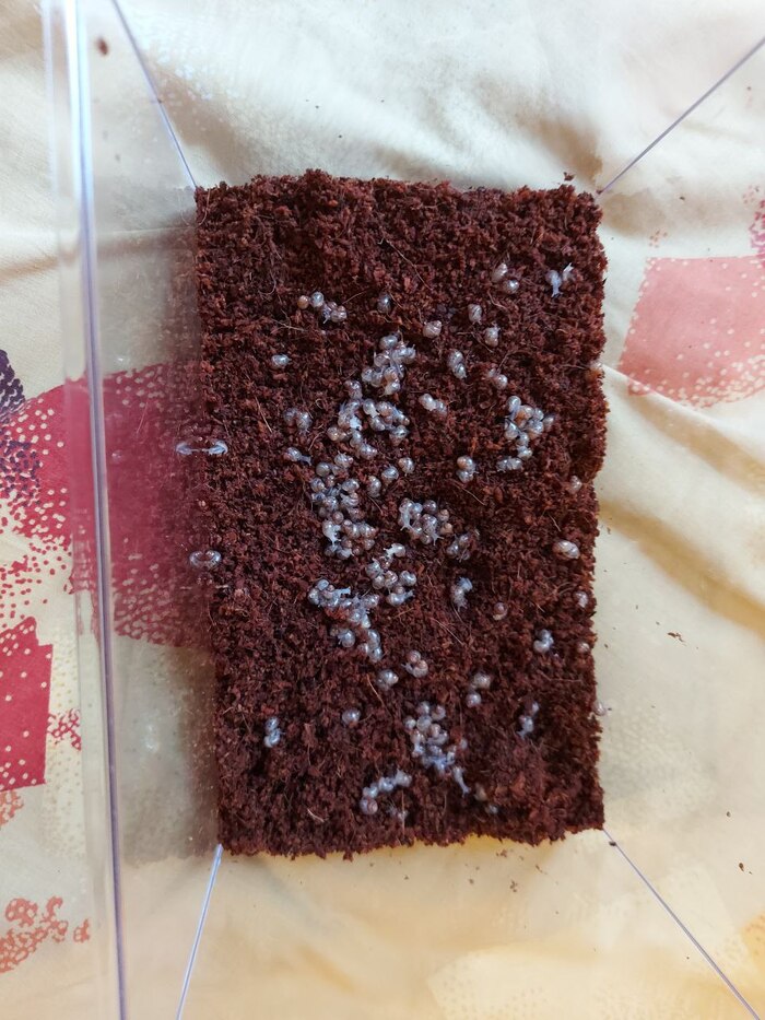 Когда они попали ко мне - это был стаканчик с кокосовым субстратом и кучкой яиц. Он около месяца вызревал в ванной, где +- тепло и влажно, и на выходе получилось следующее
