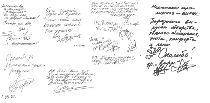 Поэтому я объяснил персоналу, что артисты это очень трудящиеся люди и им надо создать такие условия для отдыха, чтобы в их воспоминаниях  об Омске после величины гонорара мы занимали второе место. В общем то нам это удалось. К сожалению, одну из книг отзывов у нас украли при увольнении, но одна осталась. В разные времена в ней отметились "Аквариум", "Амега", "Балаган ЛТД", "Белый орел", "Блестящие", "Вирус", "Вопли Видоплясова", "Воскресенье", "Гости из будущего", "Дельфин", "Жуки", "КарМэн", "Ляпис Трубецкой", "Мумми-тролль", "Неприкасаемые", "Отпетые мошенники", "Пикник", "Премьер-министр", "Плазма", "Револьвер", "Смысловые галлюцинации", "Стрелки", "Текила-Джазз", "Хай-фай", "Ялла"; певцы Борзов, Бутусов, Валерия, Гребенщиков, Децл, Жасмин,Кузьмин, Макаревич, Минаев, Никита, Новиков, Саруханов, Слуцкий, Сукачев, Трубач, Челобанов, Цыганова, Шуфутинский; актеры Басилашвили, Е.Васильева, Догилева, Равикович, Хазанов, Шифрин; DJ Бачинский, Носков, Сундукова, Чурикова