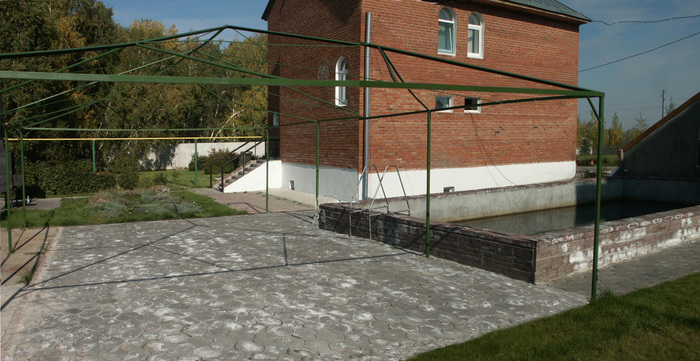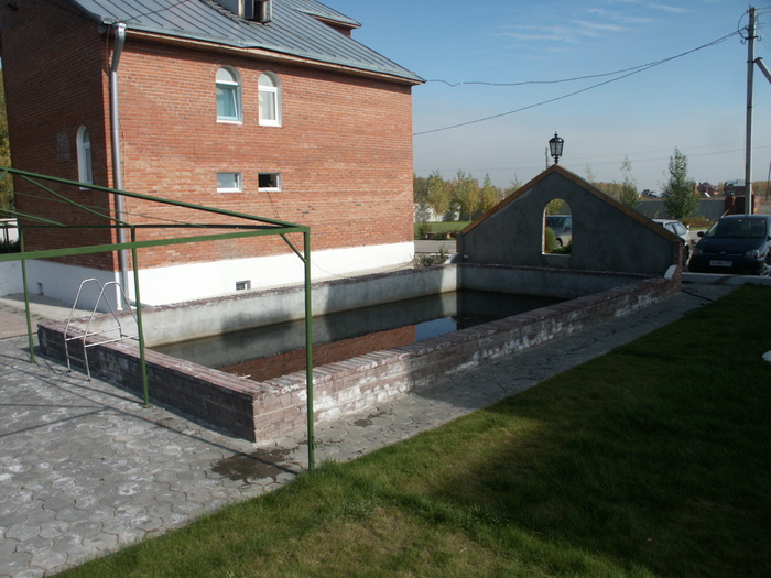 Но между домами оставалось пустое сиротливое пространство. Было решено построить там уличный бассейн- с возможным впоследствии его закрытием какими-то легким конструкциями. Утащили у моего бетонного друга бракованные перегородочные плиты, заякорили их на шпунты, чтобы бассейн не раздавило грунтом, залили сверху стяжкой из водонепроницаемого бетона  и соорудили двухуровневый бассейн- 11х5.5х (3-1,5) метров. А вот на фильтрацию воды такого объема  денег уже не хватило. Ошибку мы поняли уже на третий день после заполнения- нанесенная ветром пыль проникла в воду и получилось коричневое озеро, дна в котором видно не было.