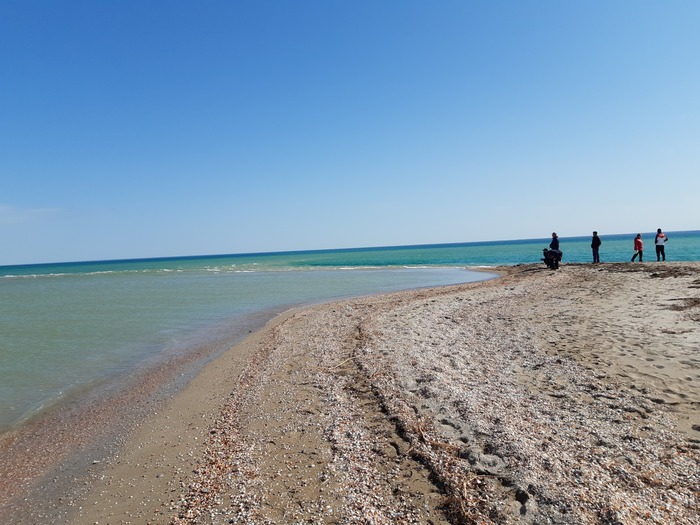 2 часа пешего хода и я на косе! Если обратили внимание на рисунок - то коса должна была тянуться до островка. Но от нее осталось очень малая часть и островок в дали. Спасибо добытчикам морского песка! Который намывался ранее в эту точку пересечения 2 заливов. Через пару лет думаю и островка не останется :(