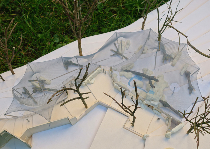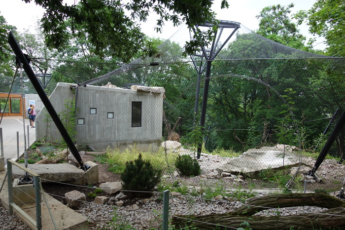 Технический проход между вольером и дорогой для посетителей является дополнительной защитной полосой, которая все же, за счет сильного падения рельефа, не является препятствием для наблюдения. Разделение между вольерами выполнено черной стальной сетью, которая за счет своего цвета не так контрастирует с местностью. Этой же сетью выполнен защитный шатер сверху.