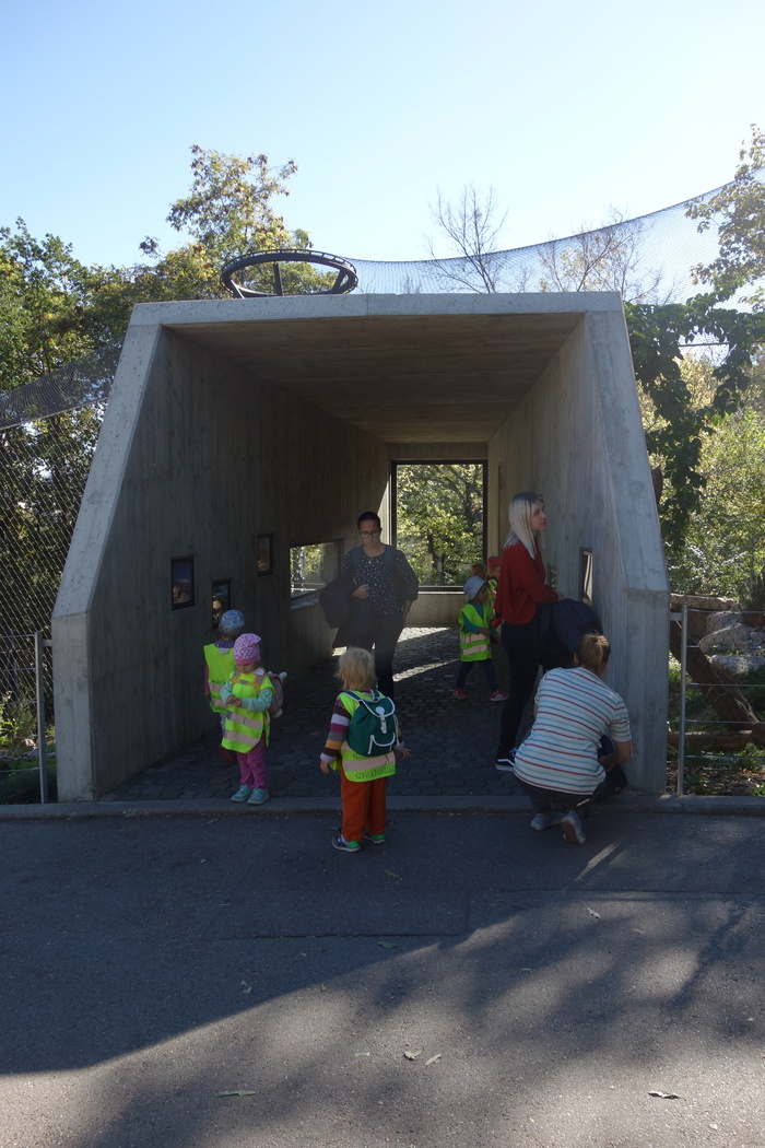 Как видно на разрезе, получилось такое двухуровневое строение. На первом уровне расположены боксы для животных и проход к ним для сотрудников зоопарка, а на втором был построенн «каменный туннель» (обозначен красным) со смотровыми окнами (направление обзора фиолетовым), который сильно вдается в вольер, и в то же время является как бы закрытым сооружениям, скрывая посетителей от животных, тем самым предоставляя им возможность комфортно использовать территорию наружних вольеров.