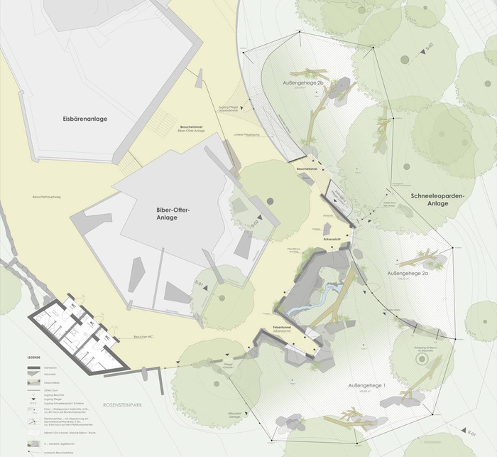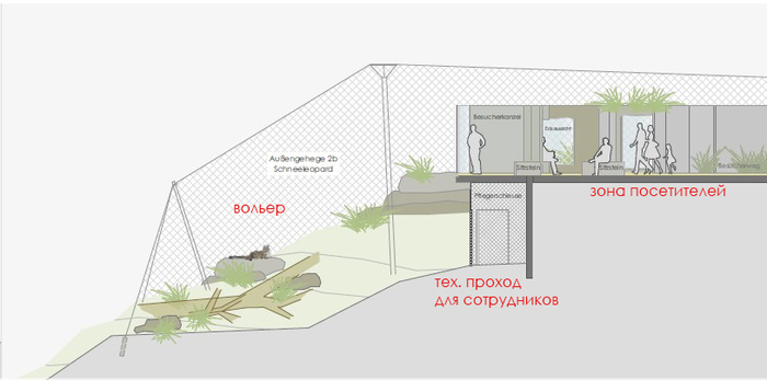 Снежные барсы по своей натуре любители укромных мест и высоты. Они обитают в природе на высоте между 3,5 и 4 тысячами метров. Они живут и охотятся в горах, подкарауливая свою жертву с высоты и настигая ее в прыжке. Исходя из этого, от нас требовалось планирование вольера с достаточным содержанием возвышенностей, укрытий, объектов для активности, где животное могло бы чувствовать себя комфортно, при этом оставаясь в видимой для посетителей зоне. Это осложнялось тем, что естественный рельеф вольера имел сильный уклон со стороны основного потока посетителей вглубь вольера.