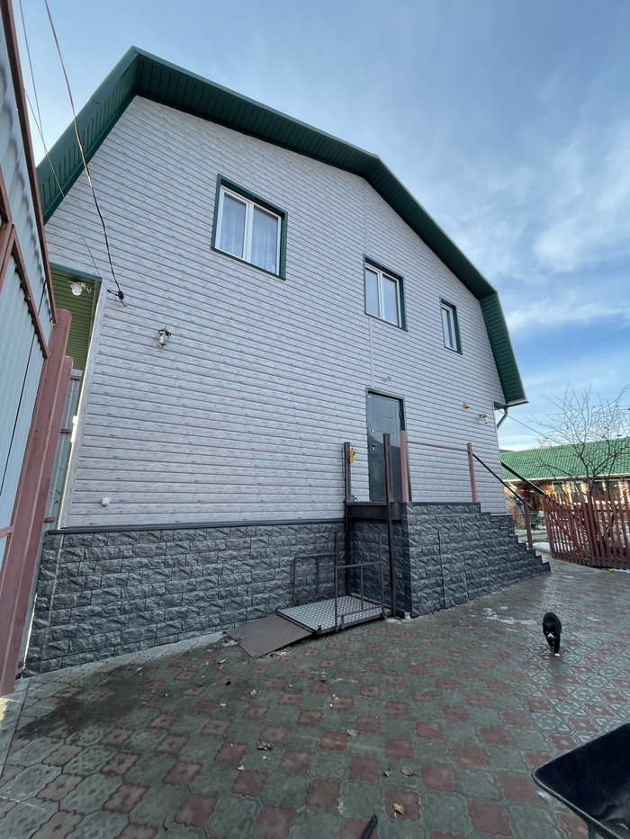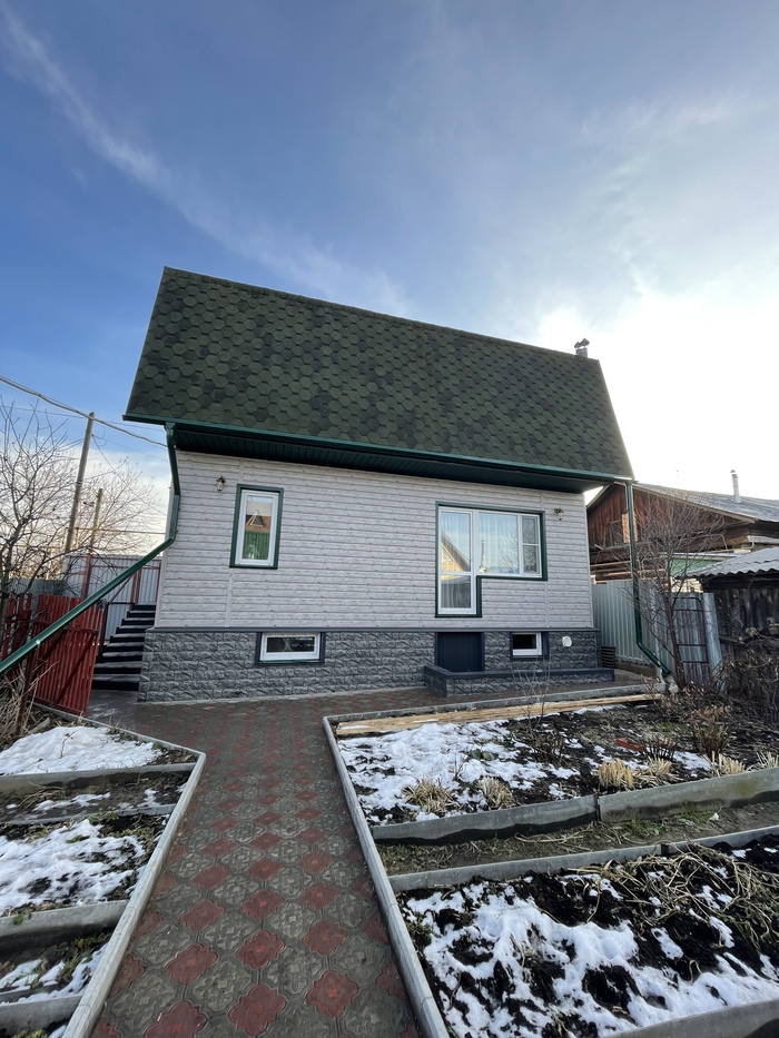 Со стороны двора всё то же самое, но решил обшить крыльцо так же, как и цоколь, а под ним сделали дверь и небольшую кладовку, так как на маленьком участке каждый метр — на вес золота.