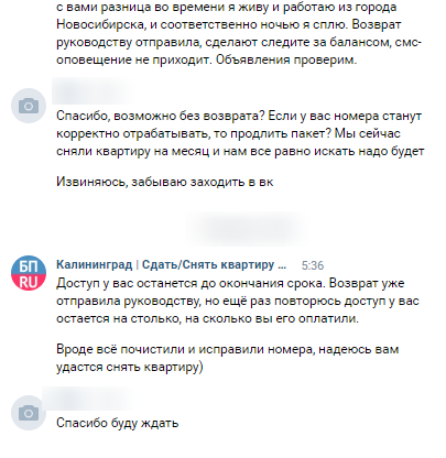 Искали когда-то квартиру в Калининграде, наткнулся на группу в ВК, потом перешел на сайт и уже там оформил подписку. При звонках по номерам из объявлений, квартиру либо не сдавали, т.е. номер был указан не верный, либо сдавали но не там, где был указан адрес (другой регион/город). В общем так и не вышли там на реальных владельцев, написал в техподдержку, после был диалог в ВК, с просьбой вернуть денег за подписку, где меня заверили, что поправят номера, сделают возврат сделают и оставят доступ к базе на оплаченный период. К тому времени квартиру уже нашли, то ждал только возврат, который за 2 месяца так и не пришел, в ВК заверили, что все отправляли. А после обещания оставить негативный отзыв, в лучших традициях обработки негатива - заблокировали.