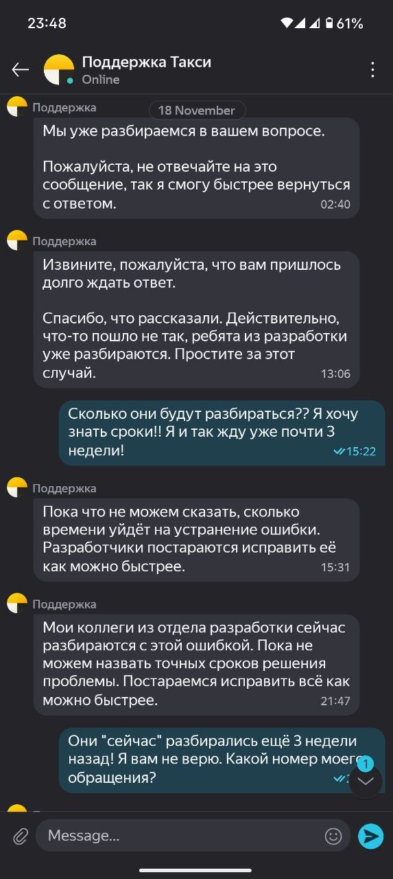 Всё это время я параллельно писал на их почту и общался с их "специалистами", которые даже не в состоянии назвать срок решения проблемы. Никакой альтернативы никто не предлагает, все отвечают по заранее подготовленному скрипту. Чувство, будто стучусь в ворота, которые не умеют открываться и никогда не умели. Всем плевать, что я из-за этого не могу совершать рабочие поездки! Мне жизненно необходимо иметь доступ к такси, тк на такси перемещаю оборудование для работы. Своей машины нет, на общественном транспорте перемещаться с таким багажом тоже нереально. И все эти проблемы из-за ошибки в работе приложения Яндекс. И эту проблему никто не спешит исправлять, ведь сегодня уже 8 декабря.