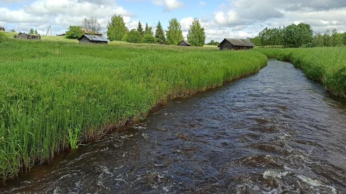 Мы попали в мертвую деревню с маленькой, но красивой и быстрой речушкой. Отсюда до соседней деревни у меня проложен трек по спутниковым снимкам, там, где видны какие-то следы.