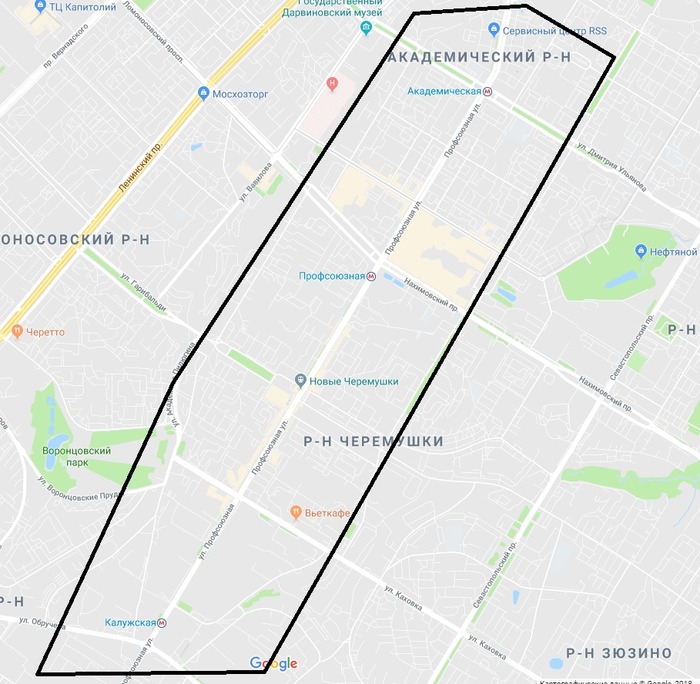 Началось все в 2018 году, а именно в августе того года. Тогда я уже учился на 3-м году обучения в аспирантуре и поскольку учеба заканчивалась в конце сентября, решил заранее позаботиться о поиске съемного жилья. Я тогда еще работал и за неимением большого количества свободного времени решил обратиться к риэлтору. Очертил ей район, где хотел бы жить. На тот момент это была зона вдоль Калужско-Рижской линии в пределах между станциями метро Калужская и Академическая c радиусом доступности станций не более 15 минут пешком.
