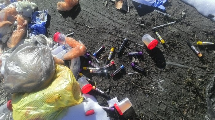На трассе Челябинск - Миасс (недалеко от поселка Мисяш) прямо на обочине обнаружены медицинские отходы класса Б. Сотни шприцов, банки с анализами, пробирки с кровью.