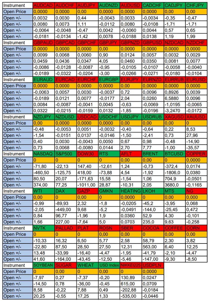Весь перечень анализируемых активов указан ниже в общем количестве 62 инструмента. Здесь Вы найдете активы рынка Форекс, популярные активы Московской биржи, не менее популярные активы Чикагской биржи СМЕ и мажор криптовалютного сегмента - Биткоин, за которым следуют все альткоины.