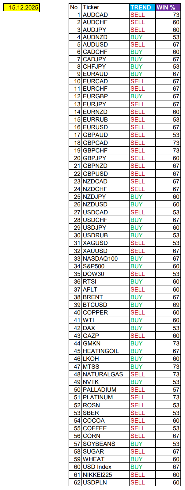 Очередные сезонные тенденции на понедельник 15 декабря 2025 по основным мажорам финансовых рынков.