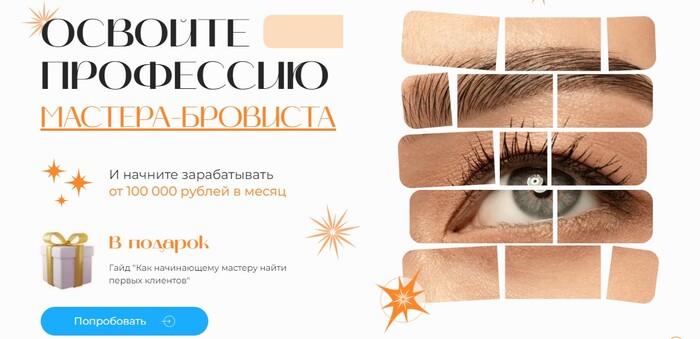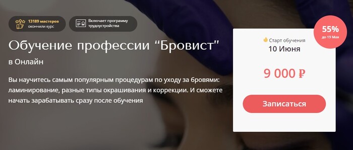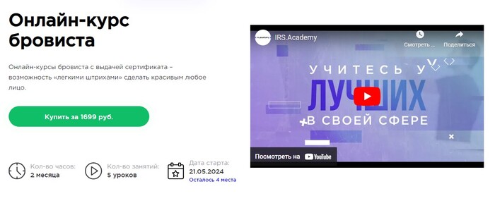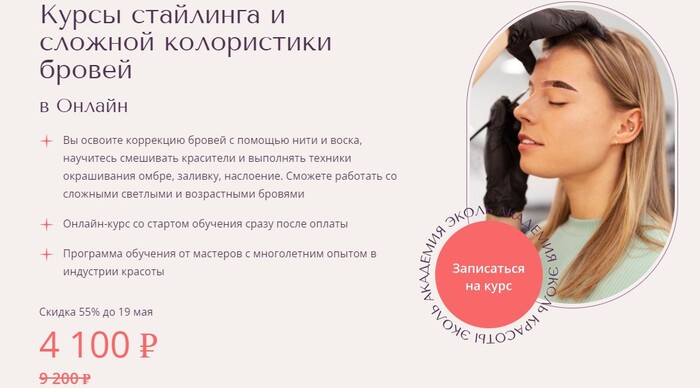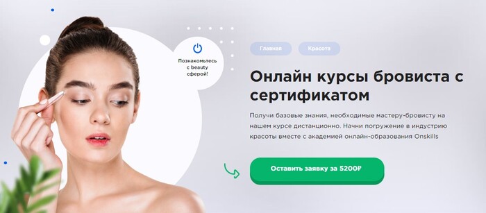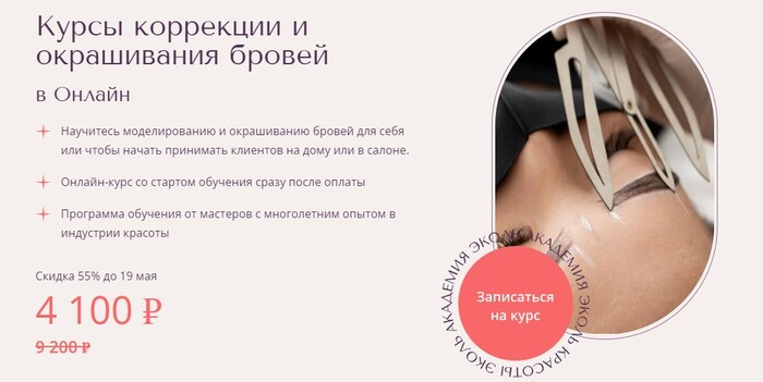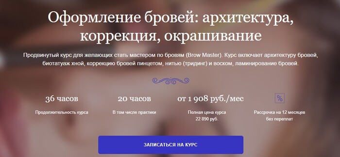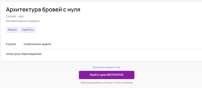 Онлайн-курс доступен на этой платформе бесплатно сразу после регистрации. Вы можете оценить особенности проведения обучения благодаря неограниченному доступу к первому уроку. В ходе обучения вы поймете, как моделировать брови, работать с проблемными волосками, выполнять коррекцию в разных техниках и узнаете, как начать работать по новой профессии.