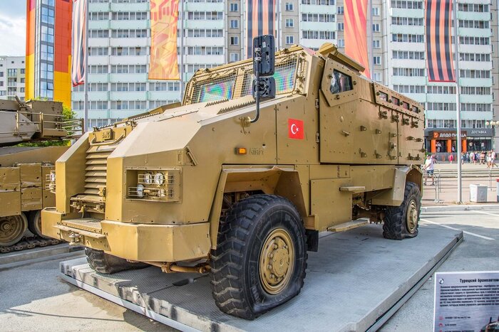 Продолжаем экскурсию. Турецкий бронеавтомобиль Kirpi. Бронирование автомобиля дает защиту от бронебойных пуль и осколков арт. снарядов. Дополнительная защита спасает даже от снарядов РПГ. На крыше управляемый из салона пулемёт, перевозит 13 человек, включая трех членов экипажа.