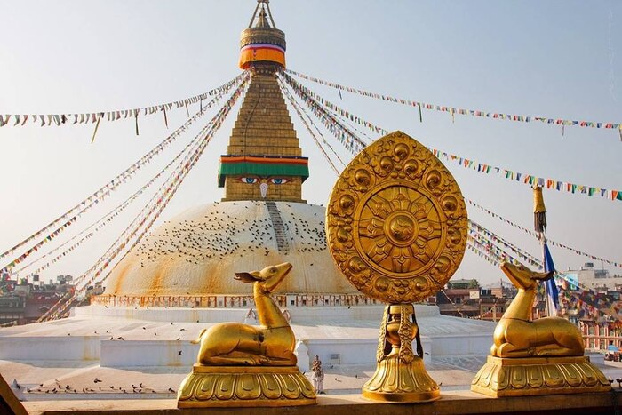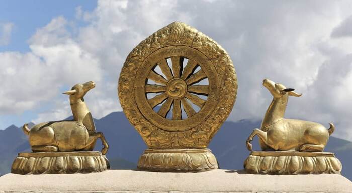 Колесо Учения (Дхармачакра) - один из главных символов буддизма. Оно обычно изображается с восемью спицами, которые символизируют Восьмеричный Путь, ведущий к освобождению от страданий. По бокам колеса часто изображают двух оленей (или ланей) - это напоминание о месте первой проповеди Будды в Оленьем парке Сарнатха, где Учение о Четырёх Благородных Истинах и Восьмеричном Пути было впервые передано миру.