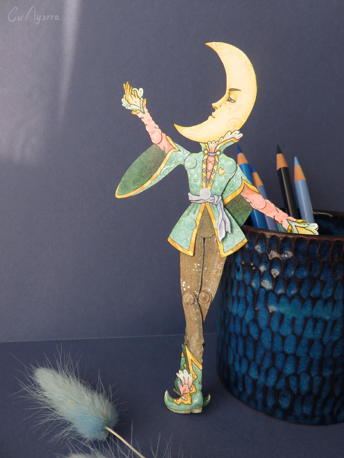 Господин Месяц, ждущий свою Леди Солнце (я всё ещё надеюсь сделать и её), был сделан ещё в конце лета-начале осени. Это односторонняя кукла, покрашенная цветными карандашами - воспользовалась ими, чтобы записать что-то вроде мастер-класса, и подумала, что акварель более труднодоступна и может отпугнуть желающих витающей вокруг неё аурой сложного материала.