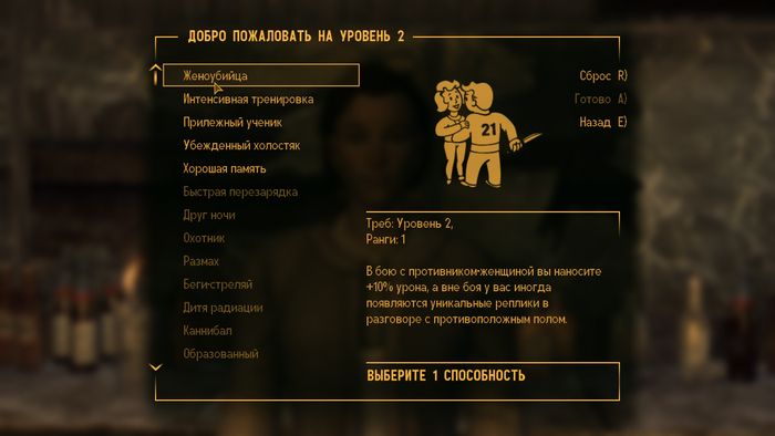 10. Однако большая часть игры это получение "перков" или умений. Они разные, и зависят от прокачанных параметров. Ну например, если вам нравится подкатывать к девушкам, то берите этот. Правда если никто не даёт, не беда! Урон повышается против женщин на 10%. Хорошо что в эту игру, не играли феменистки