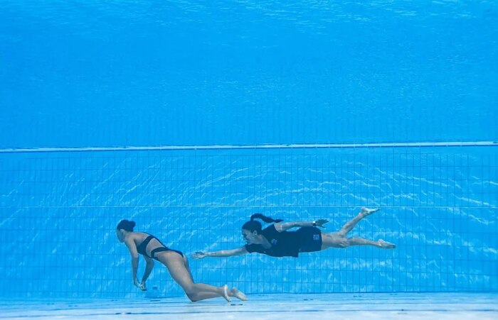 В этот миг никто не понимает, что происходит. Кроме одного человека — тренера Андреа Фуэнтес. Без колебаний она бросается в воду, разрезая поверхность решительным рывком. В одежде, без подготовки, она доплывает до подопечной и поднимает её к поверхности. На фотографиях — не просто спасение, а момент, где ответственность сильнее аплодисментов.