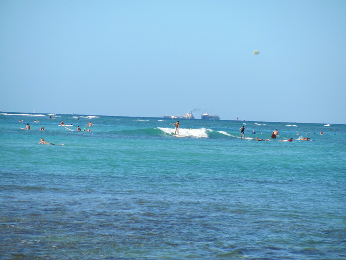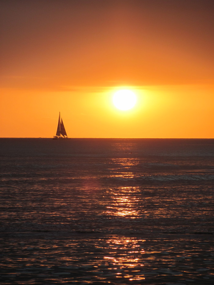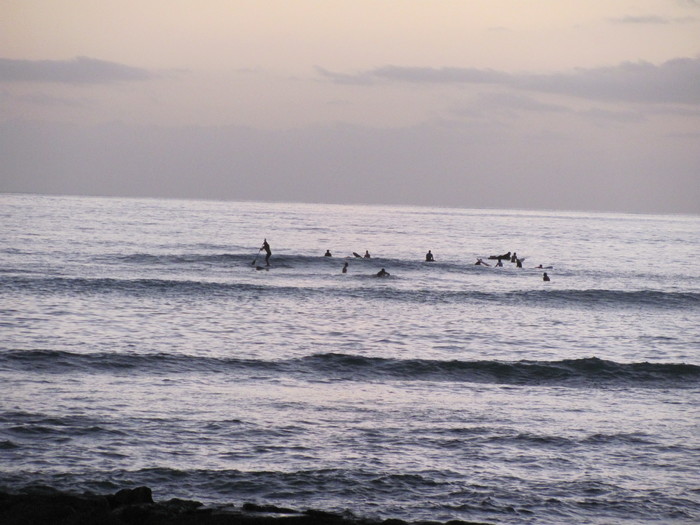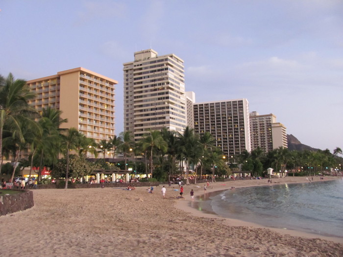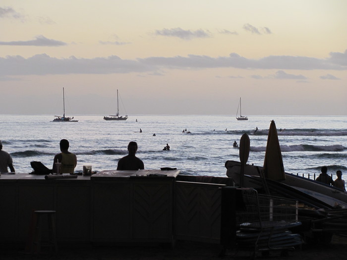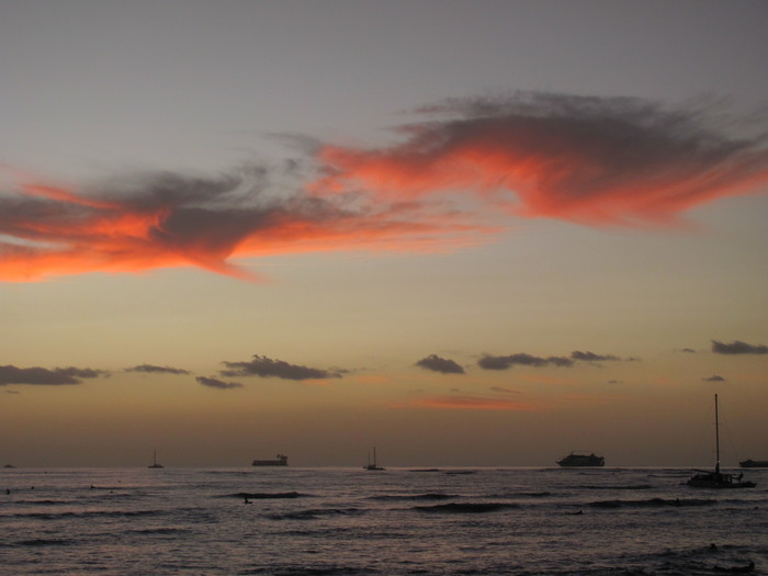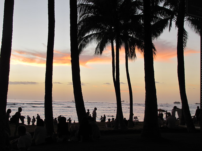 Ну.. день изменений не принес. Вроде надо суетиться, бегать,хотеть что либо увидеть, но утром пляж.. пару часиков( было б книг побольше, было б подольше), апосля отдых в кондиционированном помещении, обед, праздное ничегонеделание на улицах Гонолулу, вечернее купание, наблюдение заката солнца - прям в океан садиЦЦа.. Кррррасота..! Здесь есть специальные туры, где отвозят на 2-х часовой ужин в море закат посмотреть.. На агроменном катамаране.. официанты, белые перчатки, шампанское остывает в ведерке со льдом.. Съездил бы.. да пока не с кем..Причем это не дорого! Может таким образом с островом попрощаться..? Пока не знаю.. У меня здесь еще неделя..