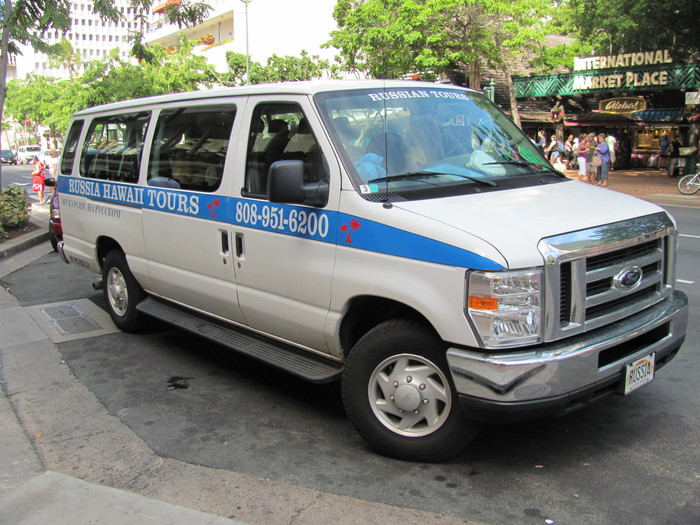 После пляжа прогулялся бессмысленно по Вакики, и уже повернул к ресторану, какиз ряда проезжающих авто глаз выхватил надпись "RUSSIA". Опаньки! Посайгачил за этим вэном, в нем люди а по брорту надпись РУССКИЕ ЭКСКУРСИИ. Благо авто припарковалось, а в нем блондинка за рулем, наушники, микрофон.Открыл я пассажирскую дверь: Мадам! Я искал Вас всю жизнь.. Ну не всю , а сутки точно! Дайте визитку и продолжайте следовать в нужном вам направлении!..