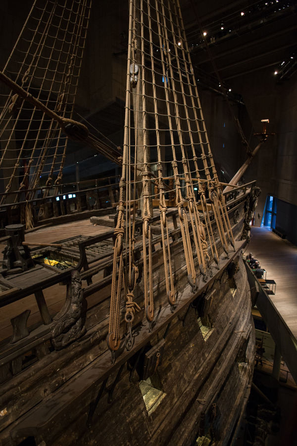 Но трудно передать, что испытываешь, войдя внутрь музея. Входишь и видишь громадную темную нижнюю часть корабля, медленно поднимаешь голову ввысь, туда, где на уровне восьмого этажа заканчиваются его мачты. А потом спускаешься на цокольный этаж, где Vasa опирается на специальные конструкции и стоят мощные нагнетатели воздуха, смотришь, читаешь, идешь вверх этаж за этажом. Там есть все – и искусно вырезанные в виде человечков перила, и толщиной с мою талию уцелевшие канаты, и громоздкие якоря, и воссозданные пушечные отсеки с пушками – и многое-многое другое, что в мельчайших деталях, очень живо и ярко создает перед глазами картину – каким получился этот бесподобный корабль.