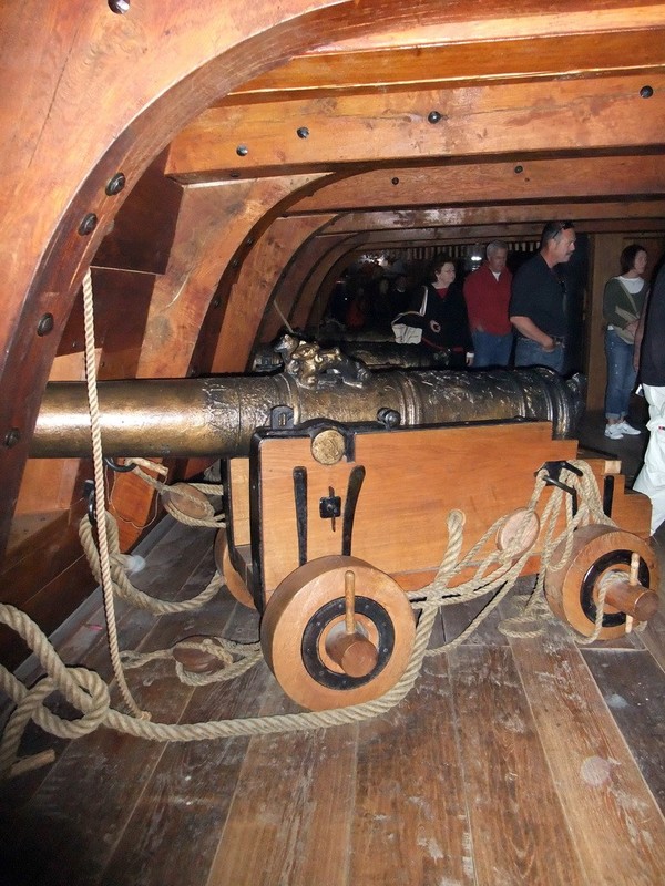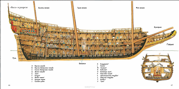 Корабль оснащен по последнему слову тогдашней военно-морской техники. На двух орудийных палубах установлены 64 бронзовые пушки, из которых 48 штук 24-фунтовые (весом более тонны каждая). Да еще шесть мортир, да большое количество пороха и самых разных ядер для морского боя.