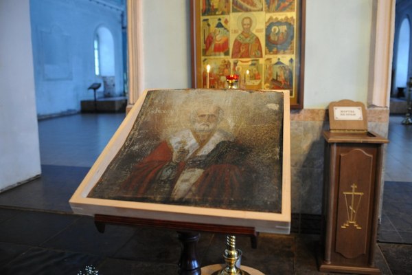 В такое чудо и не верится поначалу, как на старом советском железе такое возможно, ведь им пользовались каждый день во хлеву, оно служило тем, чтоб закрывать окно, куда на улицу выбрасывали навоз. Многие скажут, такое невозможно! Но доярка подворья на подворье со скотником-послушником монастыря пользовались выгребным окном каждый день, отодвигали этот лист и ставили обратно. Так как явно явилось изображение Святителя, не заметить его было невозможно. Лик Николая Чудотворца проявился очень четко, в цветных красках. Святой благословляет нас правой рукой, в левой держит Евангели