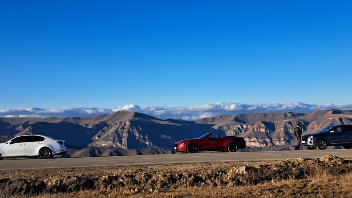 Ездил, на Джилы-Су, по дороге попался кабриолет. Замечу по дороге температура разная, конечно, но редко поднималась выше +5. На перевалах так и вообще снежок. Но если есть кабриолет то, что его таить то! А то, что свежо, ну так это терпимо, можно шубу надеть, с шапкой!