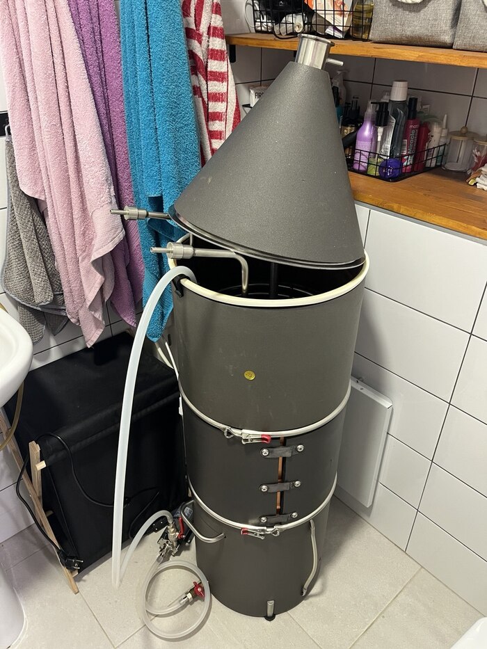 8. Также важный момент, сивуха не есть плохои онанужна в дистилляте, но не должна преобладать. Должен быть баланс и именно при должном балансе примесей будет отличный вкус. 9. Не обязательно заполнять бочку сразу на 100%. Можно разбить этот процесс на несколько подходов. Я обычно это делаю за 2-3 раза, вне зависимости от объема бочки. 10. Лайфхак для расчёта размера бочки, если работаете в квартире и только по выходным, то размер бочки рекомендую брать в два раза меньше перегонного куба, это будет оптимально по трудозатратам. В моём случае 1:1 и я затрахался за 5 месяцев, т.к. делал небольшие перерывы. Сил и энтузиазма на финише мне прибавилось от дегустации промежуточного результата, иначе бы плюнул и остановил бы работу на 70%. 11. Лучшее время для работы с солодом считаю поздняя осень - зима. Вода в это время в стояках холодная, легко быстро остудить сусло и проще, в моём случае, контролировать температуру брожения. 12. Если сырца+банк суммарно накопилось больше чем на емкость перегонного куба и в разных тарах разная спиртуозность, то я всё сливаю в ферментер, он на 127л, там всё перемешивается и с помощью погружного насосика я всё перекачиваю в куб, а остаток в ёмкость для хранения.