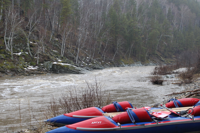 Бежим за катом, осторожно входим в порог, на удивление красиво и технично проходим («Тритон-Аргут» - всё-таки, не зря производитель рекомендовал его на пороги 5 категории, тройка для него, при нужном подходе, – пустяк) и организуем спасательную миссию за вторым перемёрзшим товарищем. Уже порядочно напуганные суровой стихией, пристёгиваем кат на страховку к берегу и только после этого отчаливаем на противоположный (он представляет собой скалистую обрывистую гряду с неочевидным местом швартовки). Верёвка натягивается в тетиву, звеня на ветру, ещё более сгущая краски. Оглашенно выгребаем поперёк течения (хорошо, что перестраховались – верёвка не даёт реке скинуть нас вниз по течению), уже счастливые садим разутого дрожащего потерпевшего и везём отогреваться к костру.