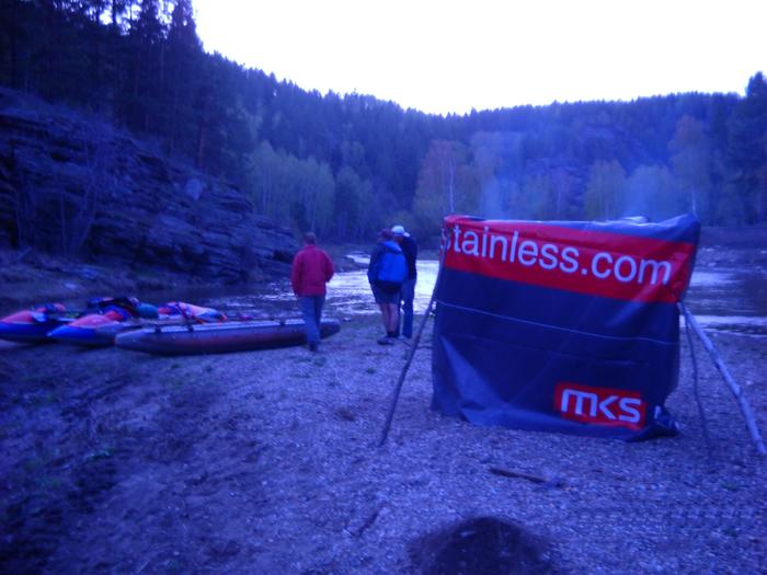 Вечером, уже в сумерках, швартуемся вблизи посёлка, с которого уже можно уехать. В темноте медленно, тяжело тащим пару километров наши каты и рюкзаки. Мой – 70кг до старта, сейчас, с вымоченными верёвками и шмотьём – хрен знает. Четвёрка в сухом виде вроде весит те же 70, но даже вдвоём не можем её поднять, ухватываемся вчетвером – только тогда поддаётся (в поезде раскрылась эта небывалая тяжесть - думал, что просто – обессилили, но когда закидывали толпой его на верхнюю полку, на нас хлынул целый водопад).