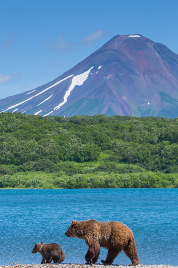Медведица с малышом. Курильское озеро и вулкан ильинский.