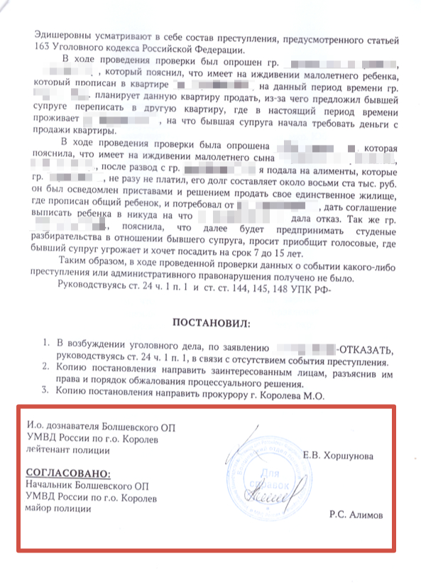 Подмена предмета проверки. В центре постановления оказался вопрос об алиментах (гражданско-правовые отношения), хотя заявление было о вымогательстве (уголовно наказуемое деяние). Наличие долга по алиментам не отменяет состава вымогательства.