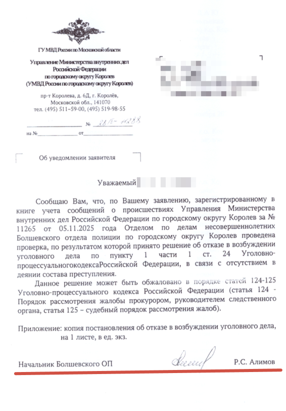 Следственный комитет (Мытищи): Заявление отправлено 13.11, 24.11 взял в работу Мытищинский отдел, назначен следователь. И... тишина. Ни звонка, ни запроса. Надежда есть, но тает. Берут трубки через раз.