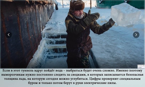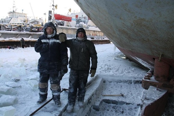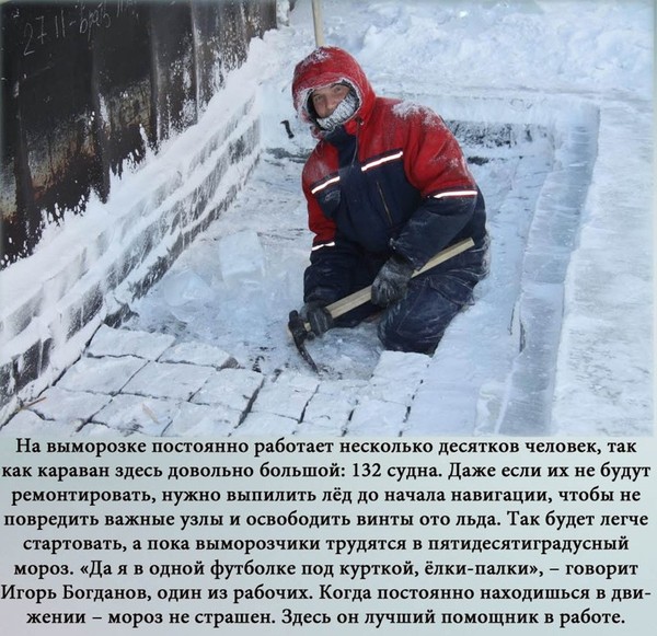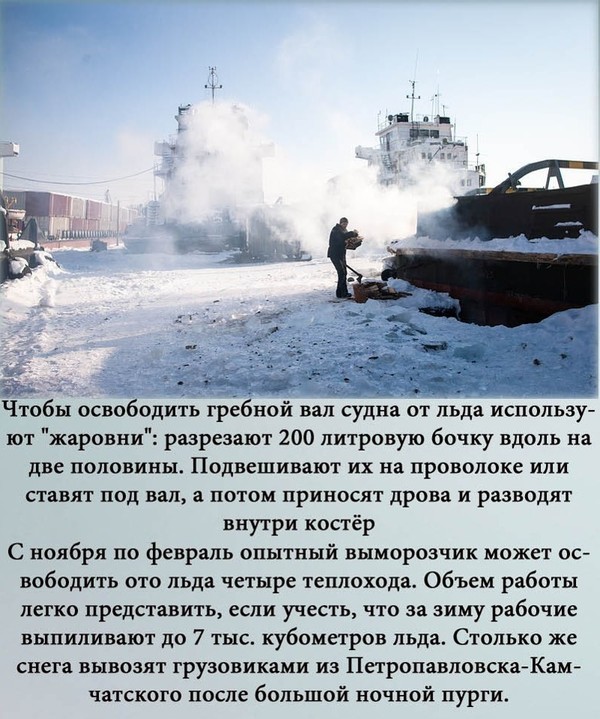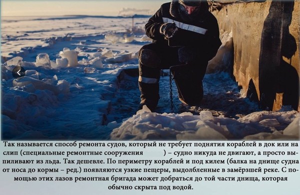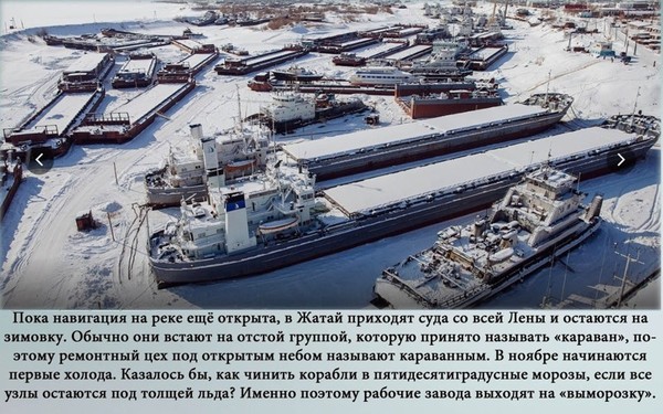 На судоремонтном заводе в Жатае для ремонта кораблей у них под днищем строят целые лабиринты во льдах: уникальный метод ремонта называется «выморозкой». В пятидесятиградусные морозы рабочие высвобождают суда из замёрзшей реки с помощью электропил, буров и молотов. Для мужчин работа, короче...